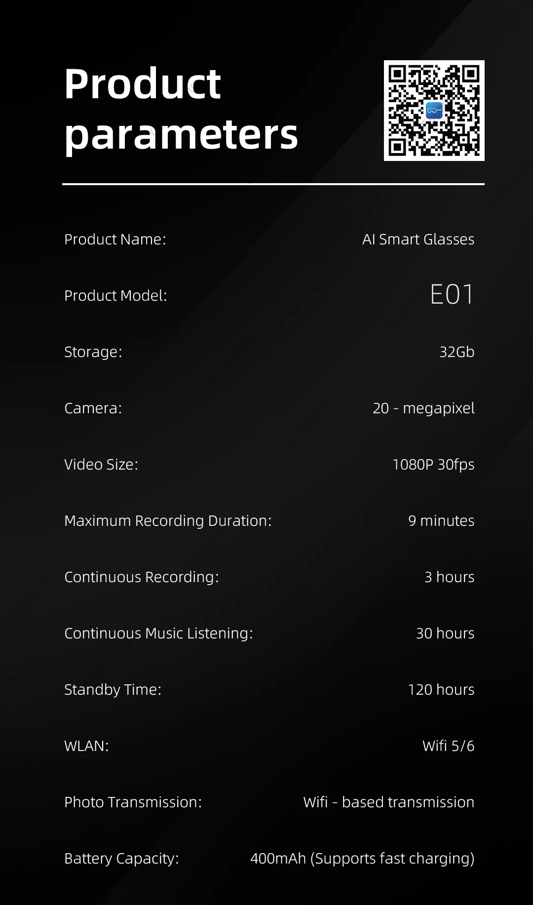 AI photo-taking and video recording fashionable smart glasses: A1 photo recognition, answering questions, taking photos, recording videos, AI dialogue interaction, Bluetooth calls, local music playback (switching, pausing music), low power consumption W20 main control chip, long-lasting battery life, dual physical buttons and dual touch buttons for convenient operation, 35g lightweight overall weight for comfortable wearing, customizable sunglasses, blue light protection, myopia, and other lenses, 260mAh large battery, IP65 dust and water resistance, ultra-low power consumption (supports continuous recording for over 2 hours without heating). Integrated with ChatGPT's advanced model, high accuracy in image recognition.