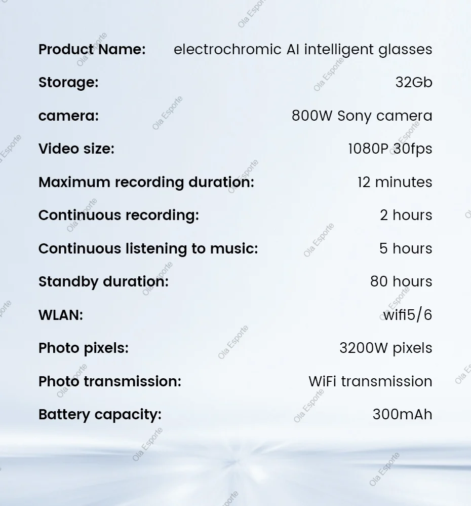 Main Features: 8 million high-definition camera, anti-shake +1200P high-definition video recording, dual microphone noise reduction system, recording, wiff+ Bluetooth real-time transmission, wearing detection, music control, voice assistant, Bluetooth call, high-definition speaker sound quality, object recognition, intelligent AI, multilingual translation, etc.