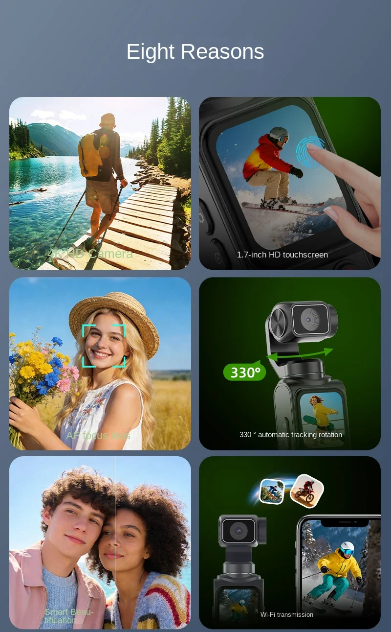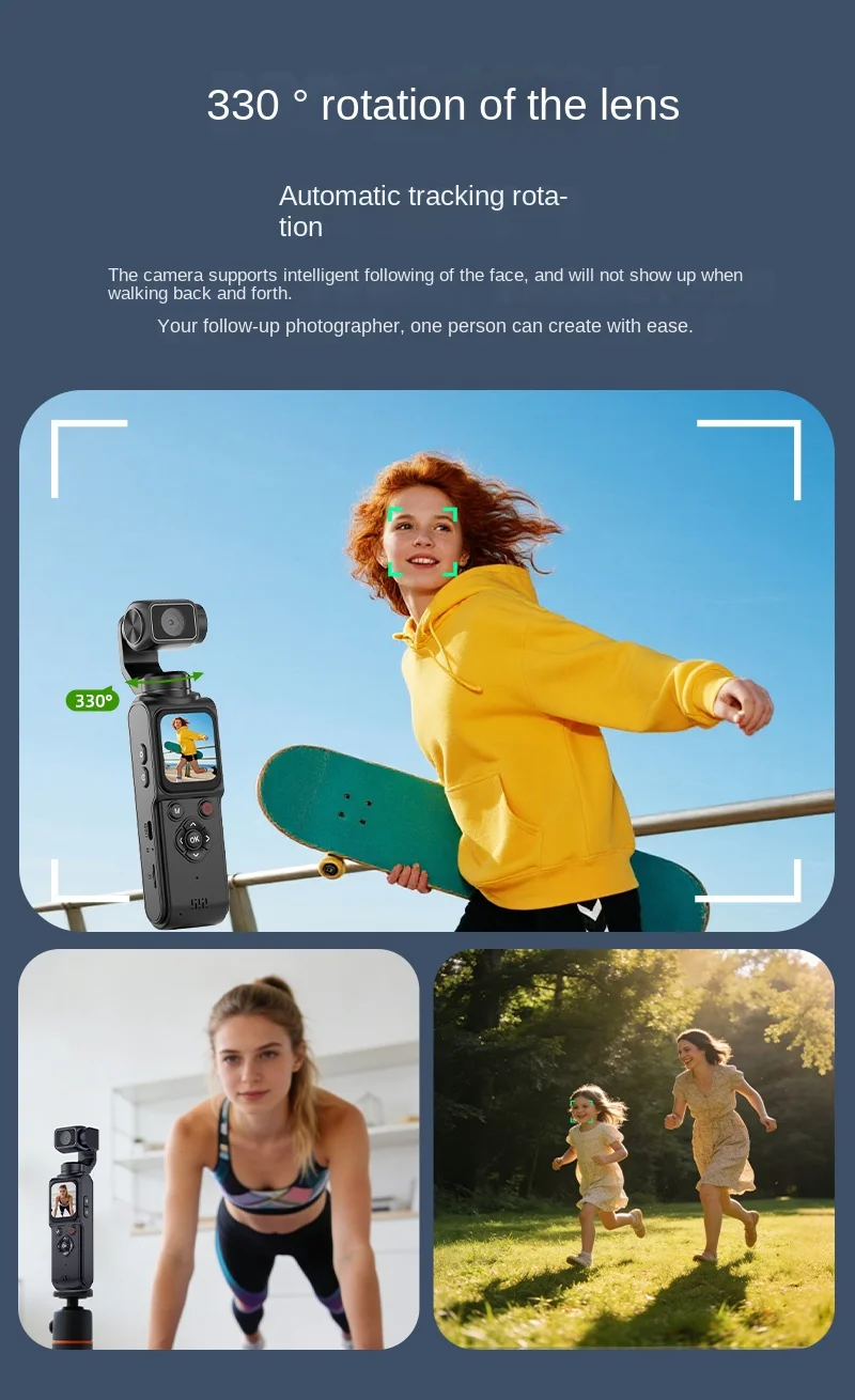 Equipped with intelligent facial recognition and tracking, this camera ensures your subject stays perfectly framed—even when you’re on the move. Whether you’re skateboarding, hiking, or creating solo content, the 330° rotation keeps you in focus, so you never miss a moment.