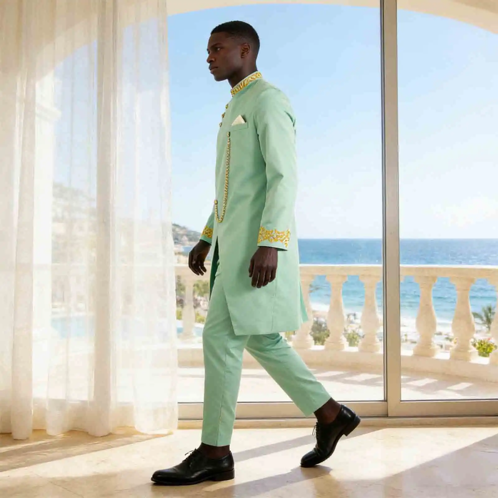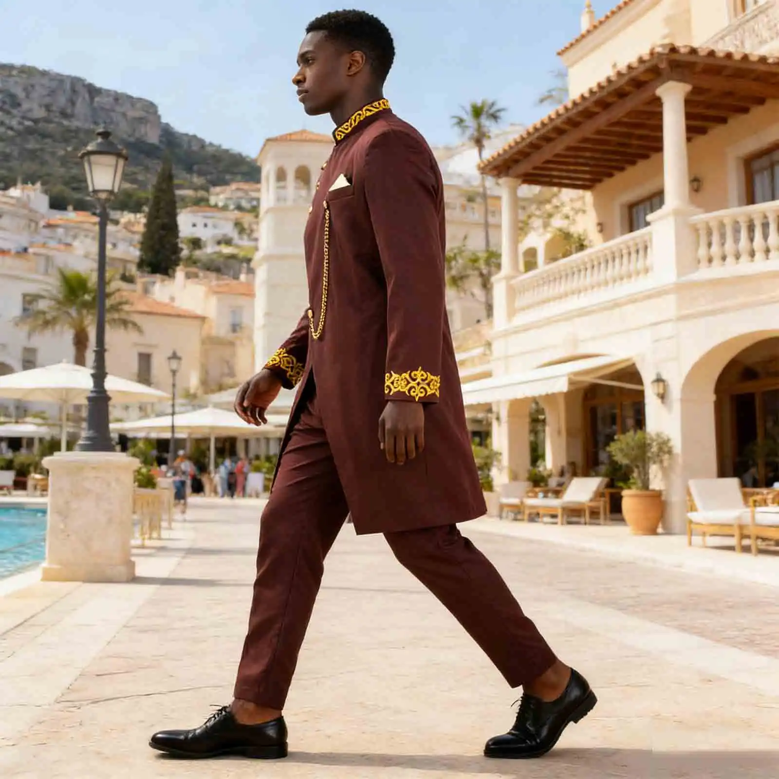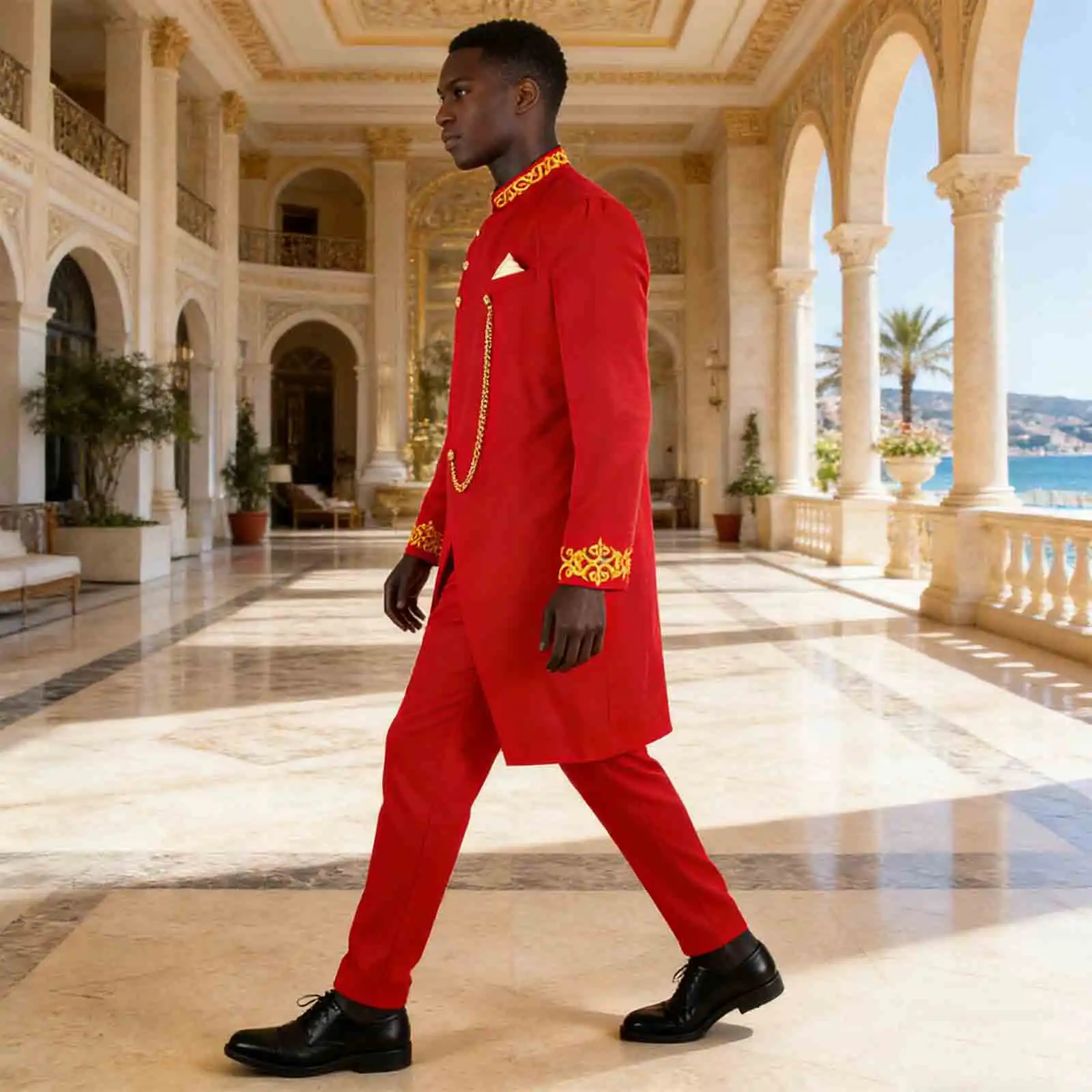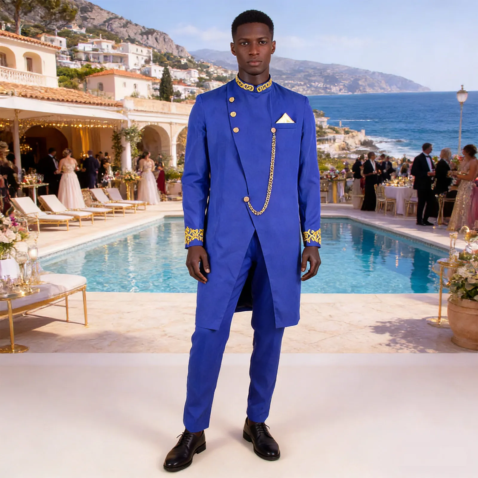 Elevate your style with this African suit ensemble, featuring intricate embroidery and a slim fit design. Perfect for weddings and formal occasions.