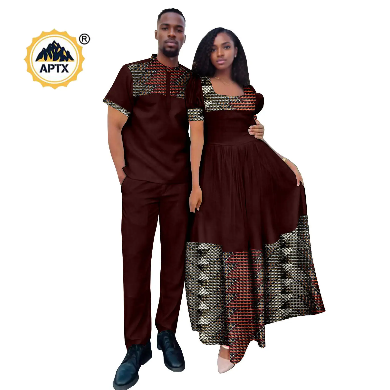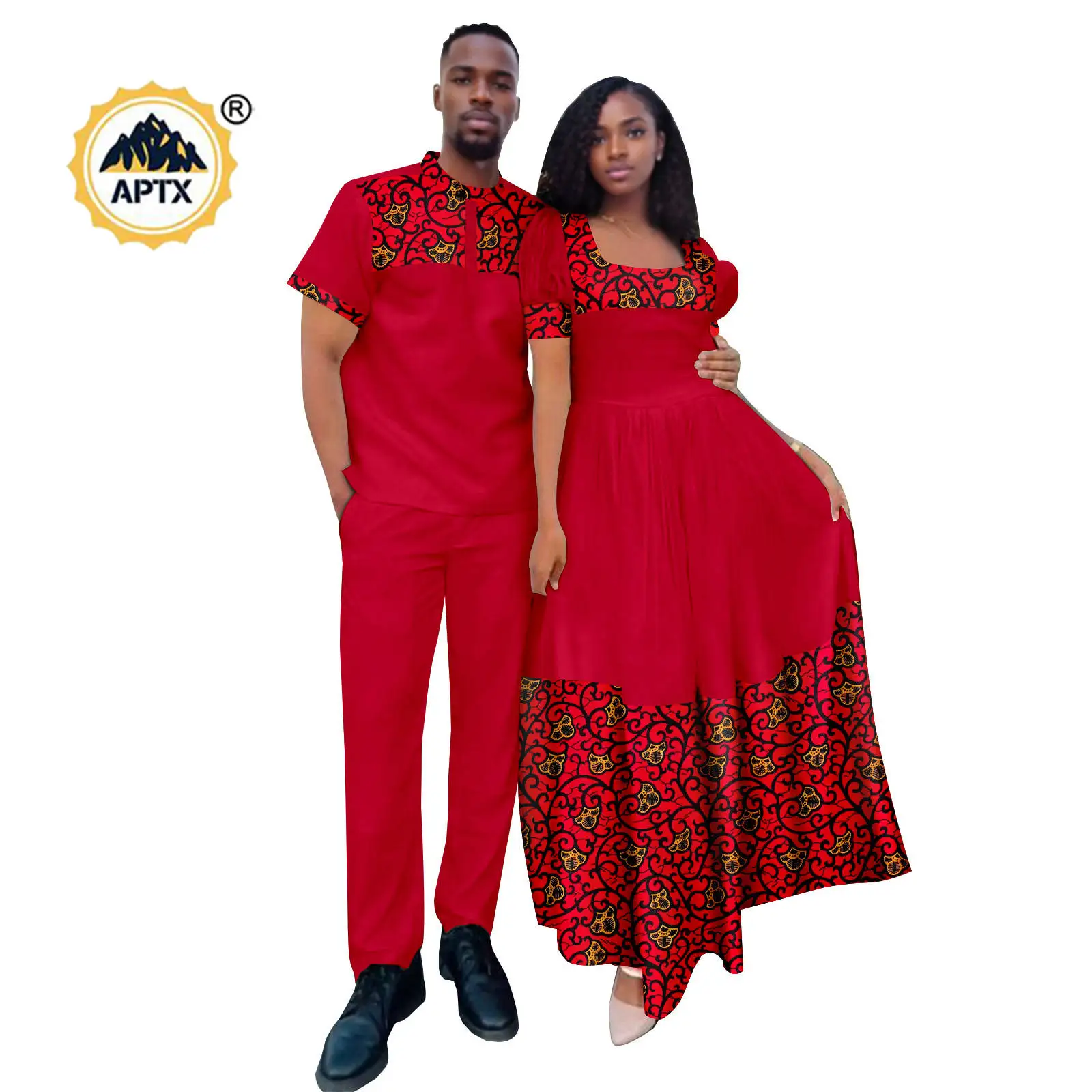 Express your colorful style with these African print couple outfits. The set includes a long dress for women with lantern sleeves and a matching Dashiki men’s top and pant set. Perfect for showing off your unique fashion sense.