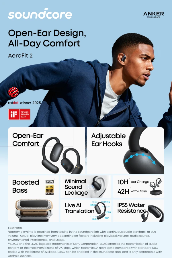 Experience a new level of auditory delight with the Anker Soundcore AeroFit 2 open-ear headphones. These innovative earbuds offer real-time translation capabilities and come with 4 adjustable positions to ensure a perfect fit for every ear size.