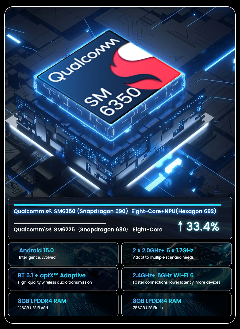 CPU:Qualcomm SM6350 Dual-core ARM Cortex™-A77, 2.0GHz+Six-core ARM Cortex™- A55