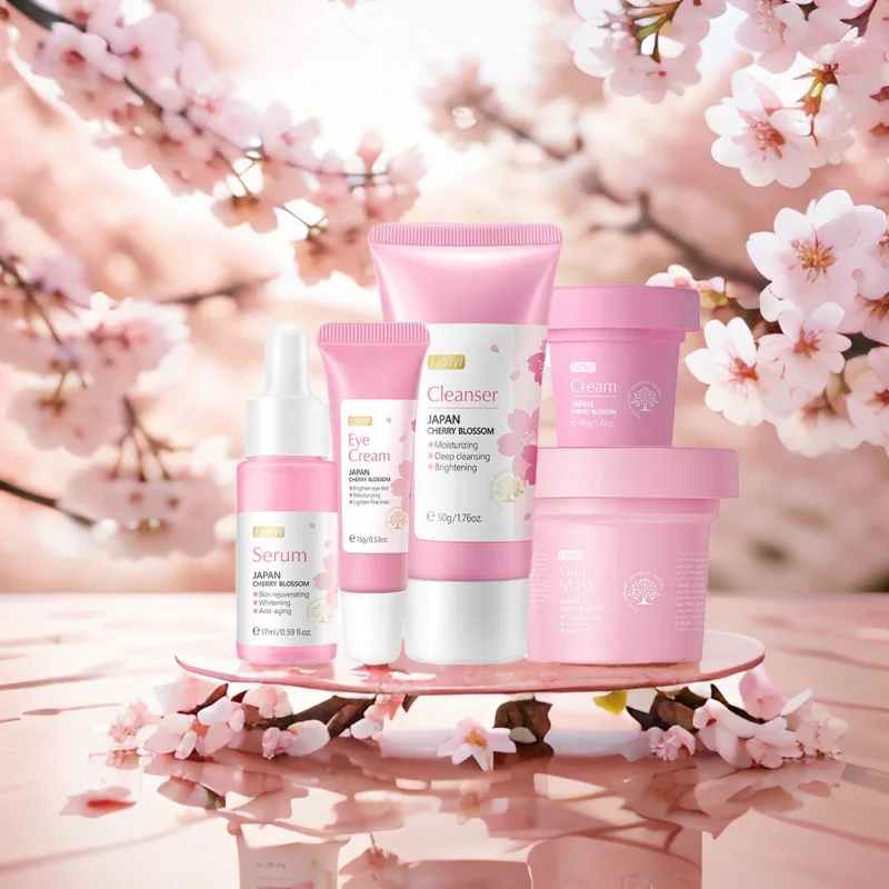 Experience the wonders of cherry blossoms with this 5pc skincare set, designed to moisturize and improve skin roughness. Enhance your skincare routine with the Sakura Moisturizing Skin Care Kit.