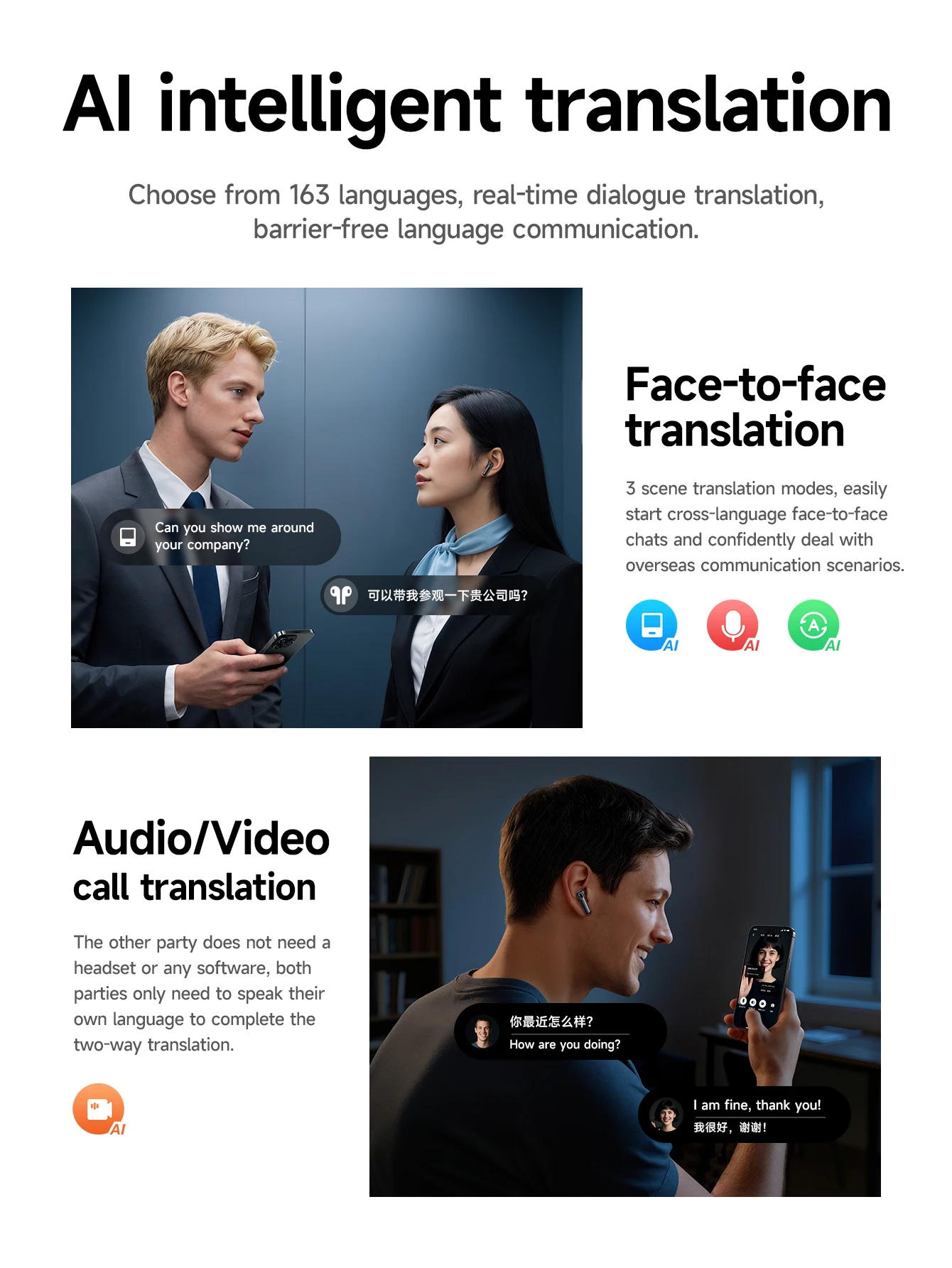 EQ27 Smart AI Translator Earbuds – Bluetooth 5.4, Waterproof Design, Long Playtime, Active Noise-Cancellation
