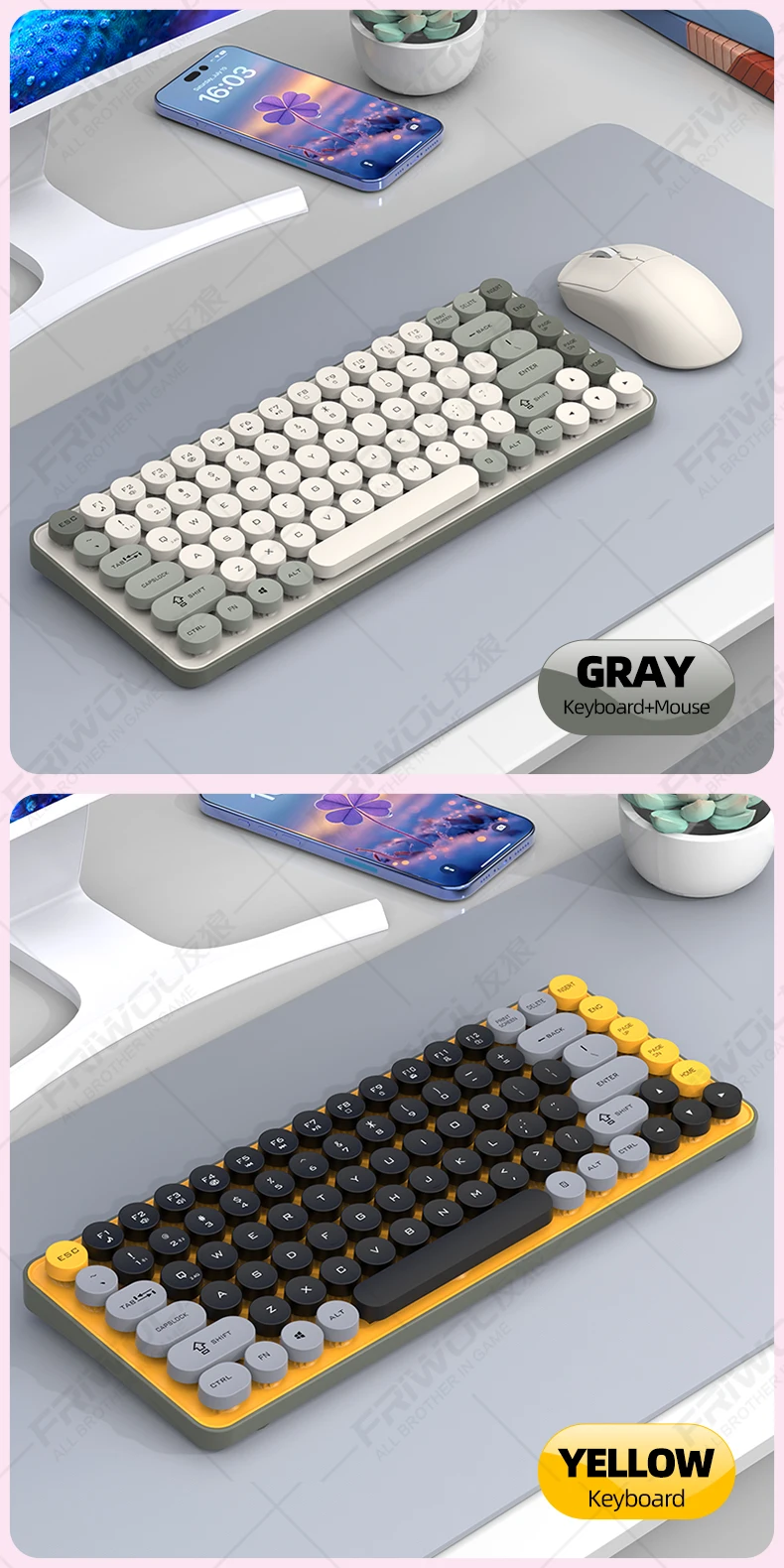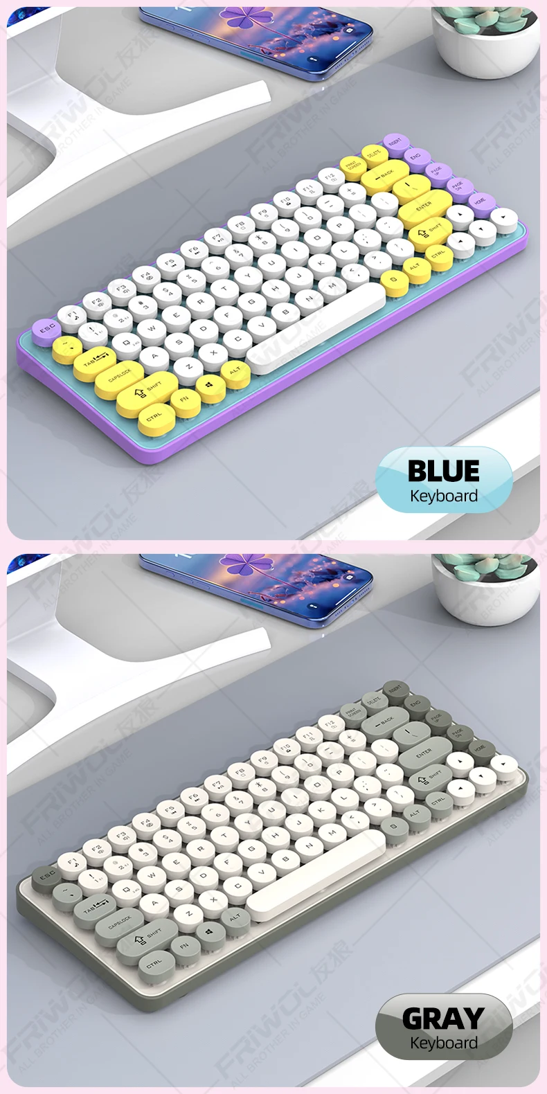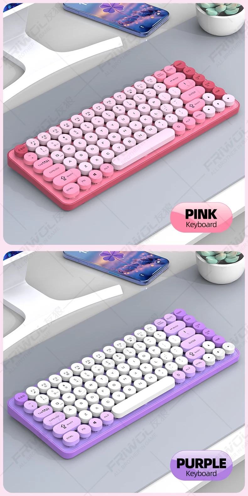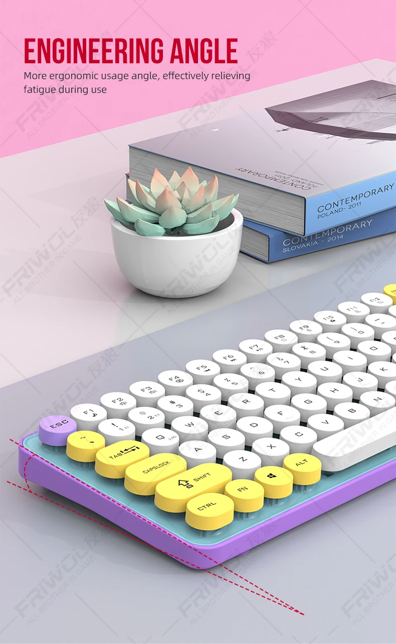 Enhance your productivity with the Friwol BT185 Bluetooth wireless keyboard and mouse set. The punk keycap design adds a touch of personality to your workspace, while the silent operation ensures a peaceful environment for both work and leisure.