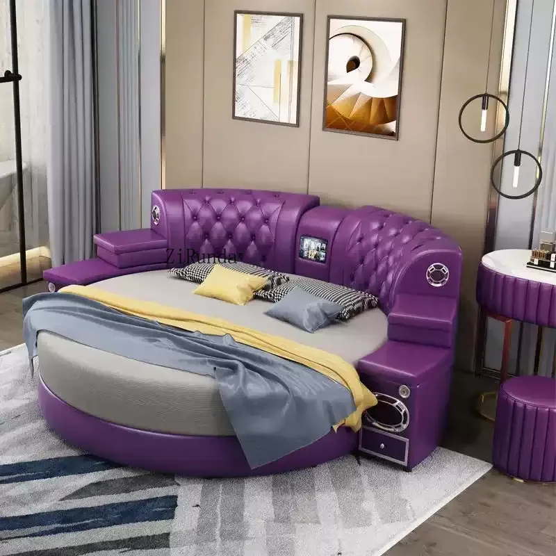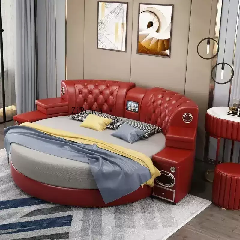 Enhance your bedroom with this modern multifunctional leather bed that features smart functions, built-in speakers, USB ports, massage capabilities, and ample storage space. It’s designed with a solid wood frame for durability and style.