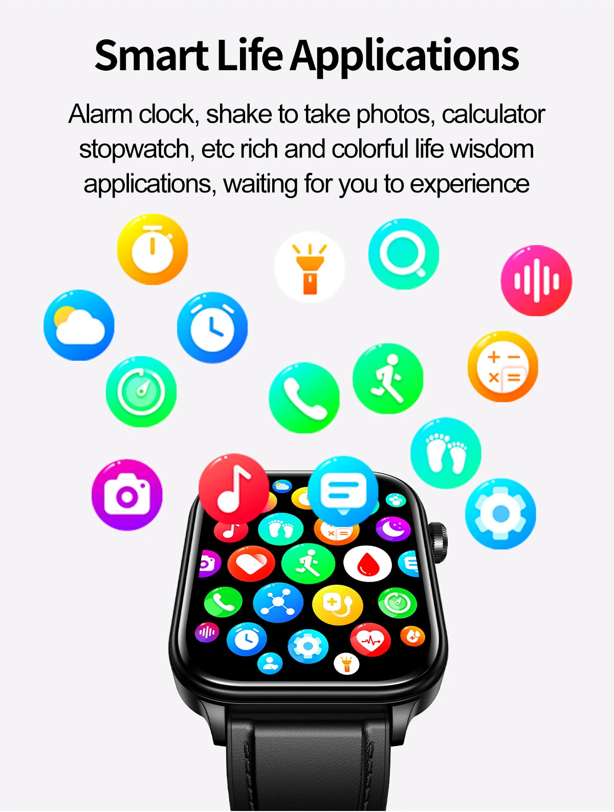 ❤ Basic Functions: Wireless call (make & answer & reject), SOS emergency call, AI voice assistant, message notification, 100+ sports modes, step, distance, calories, breathing training, massive fashion dials, custom watch face, sedentary reminder, music control, remote camera, weather forecast, alarm clock, time & date display, stopwatch, timer, calculator, raise to wake screen, social sharing (WeChat, QQ, Facebook, Twitter, etc).