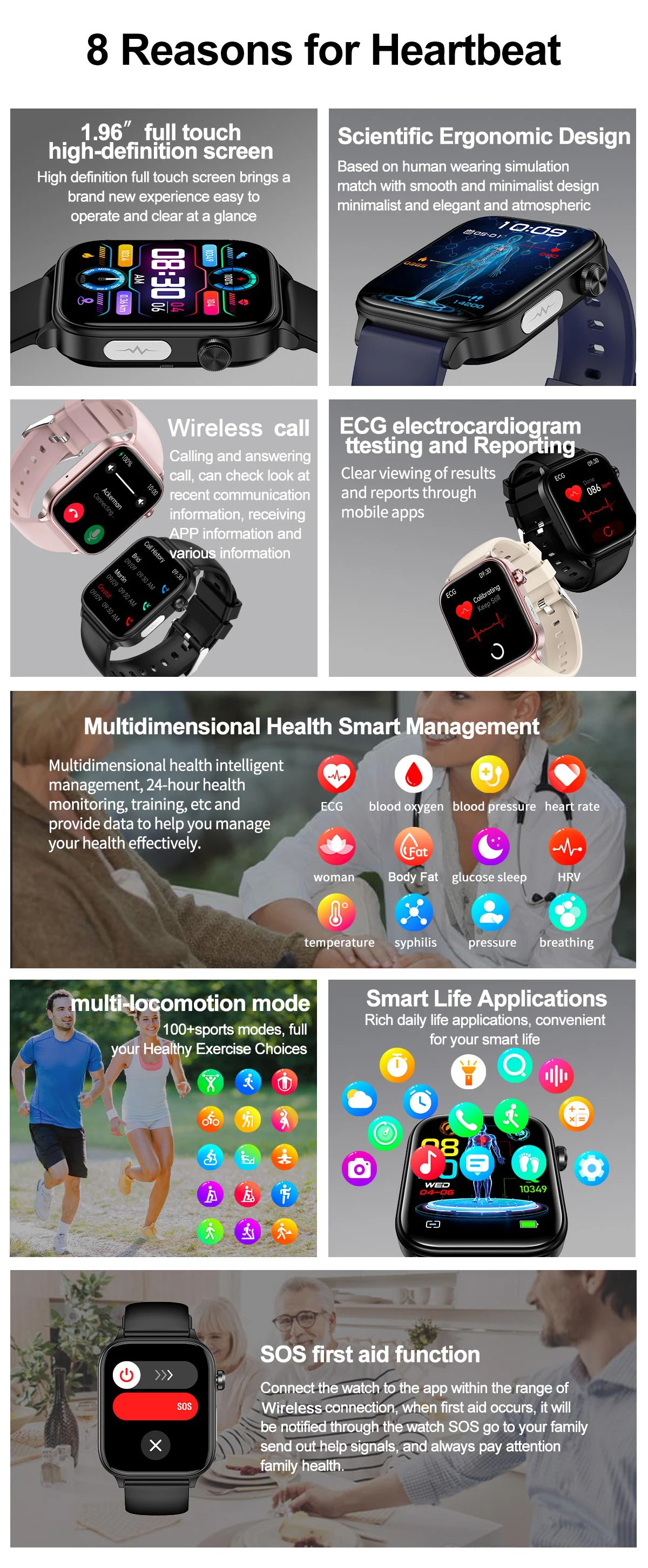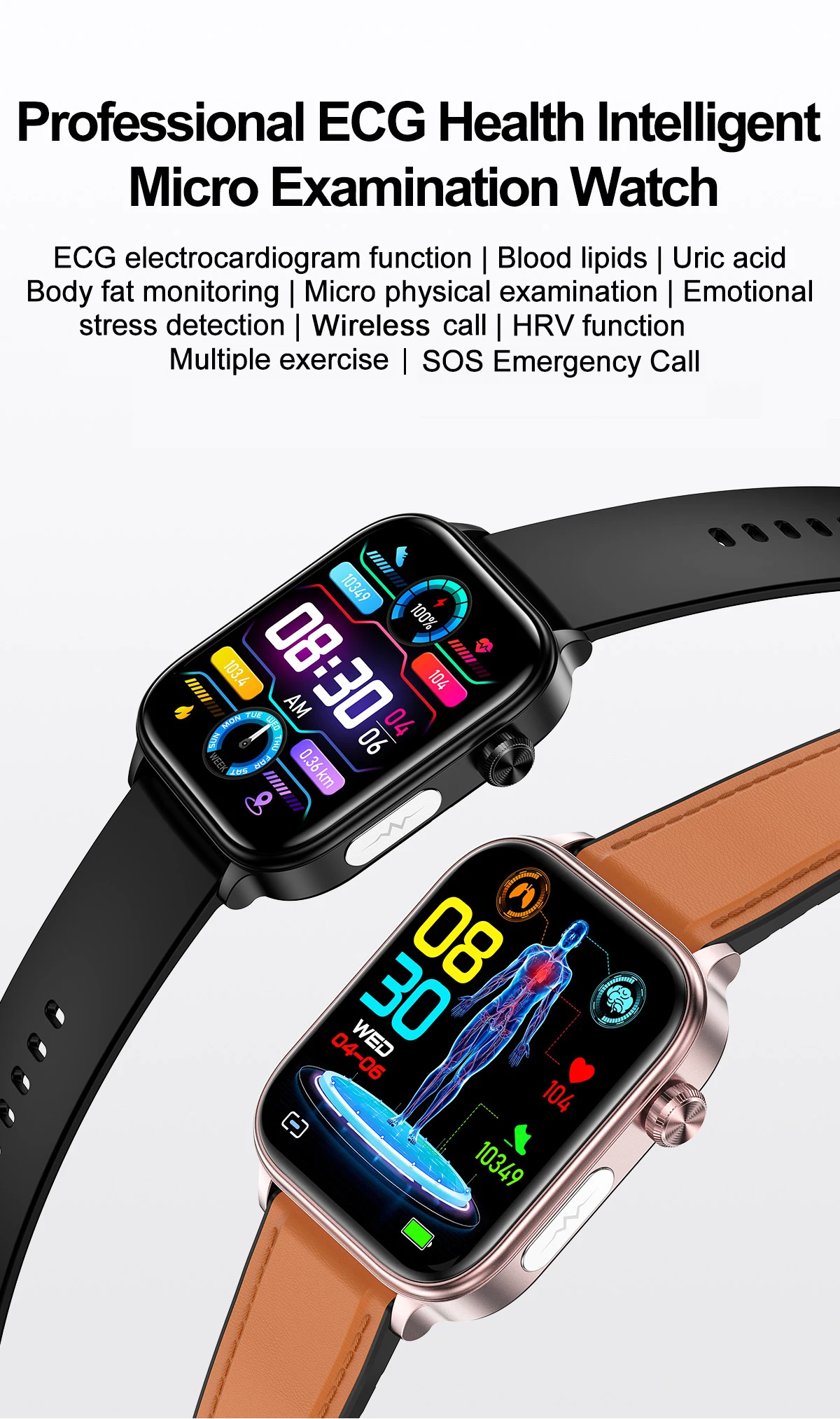 ❤ Health Monitoring: ECG+PPG (electrocardiogram), uric acid, blood lipid, BMI (body fat, muscle, etc.), micro physical examination, body temperature, heart rate, HRV, blood oxygen, blood pressure, sleep monitor, emotional stress detection, female menstrual period management, AI intelligent diagnosis, fatigue detection, MET, remote care for relatives & friends.