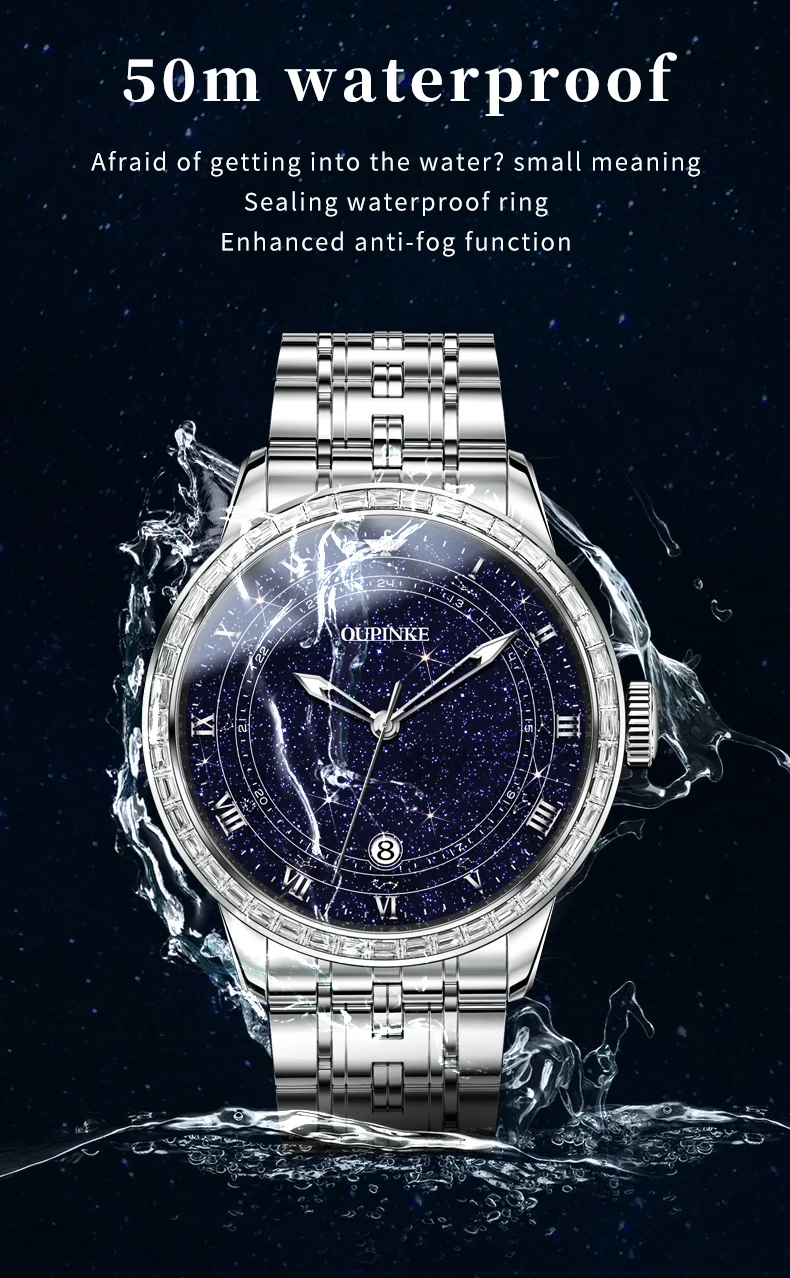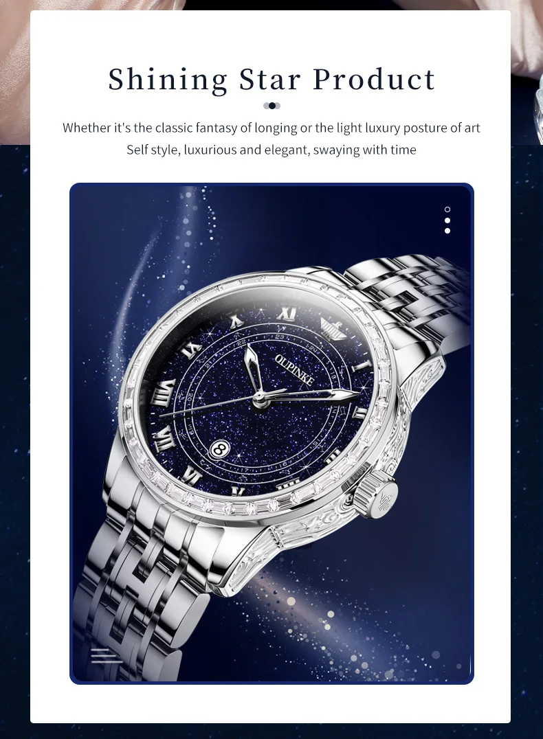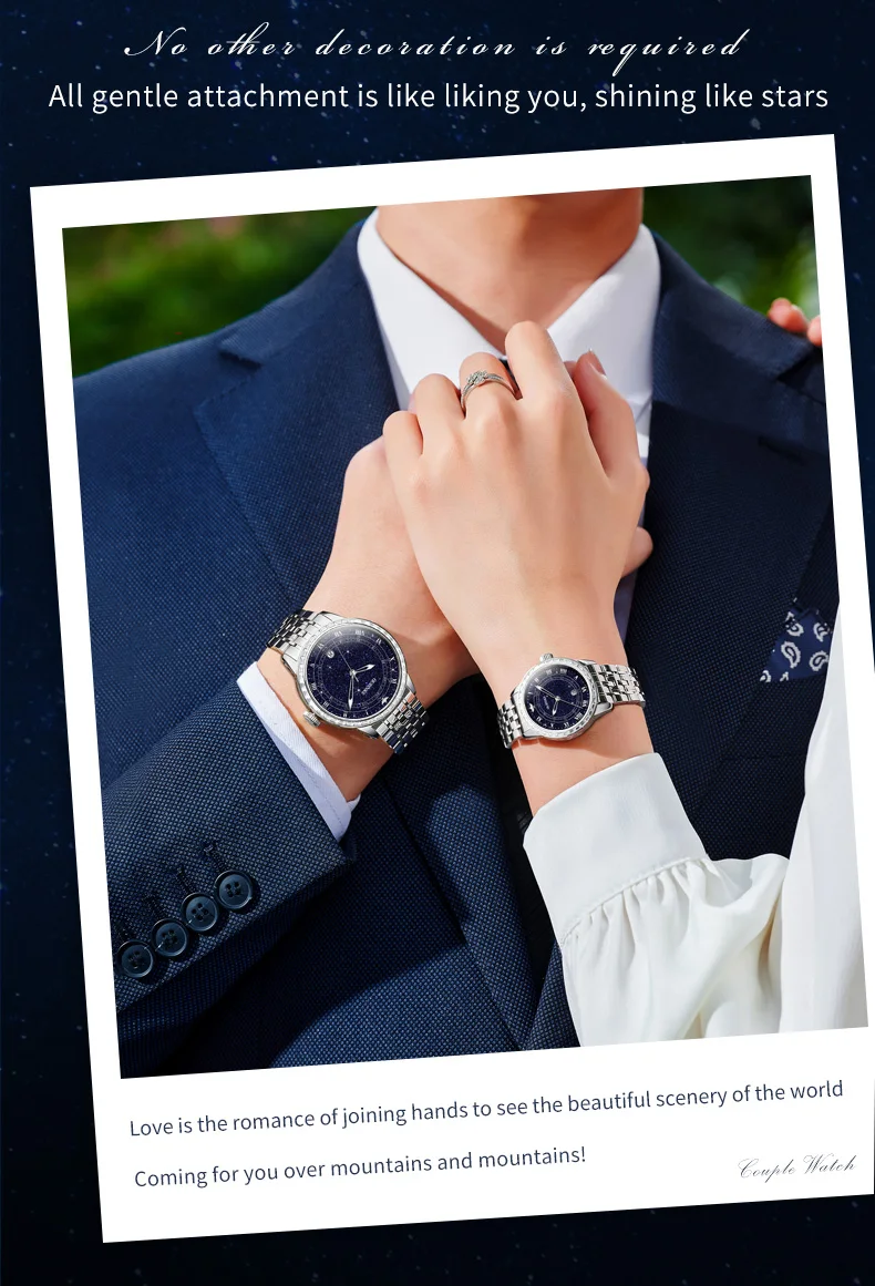 Buy this original OUPINKE couple watch set and receive free gifts! This luxury timepiece features a beautiful starry sky design with sparkling diamond accents, perfect for men and women.
