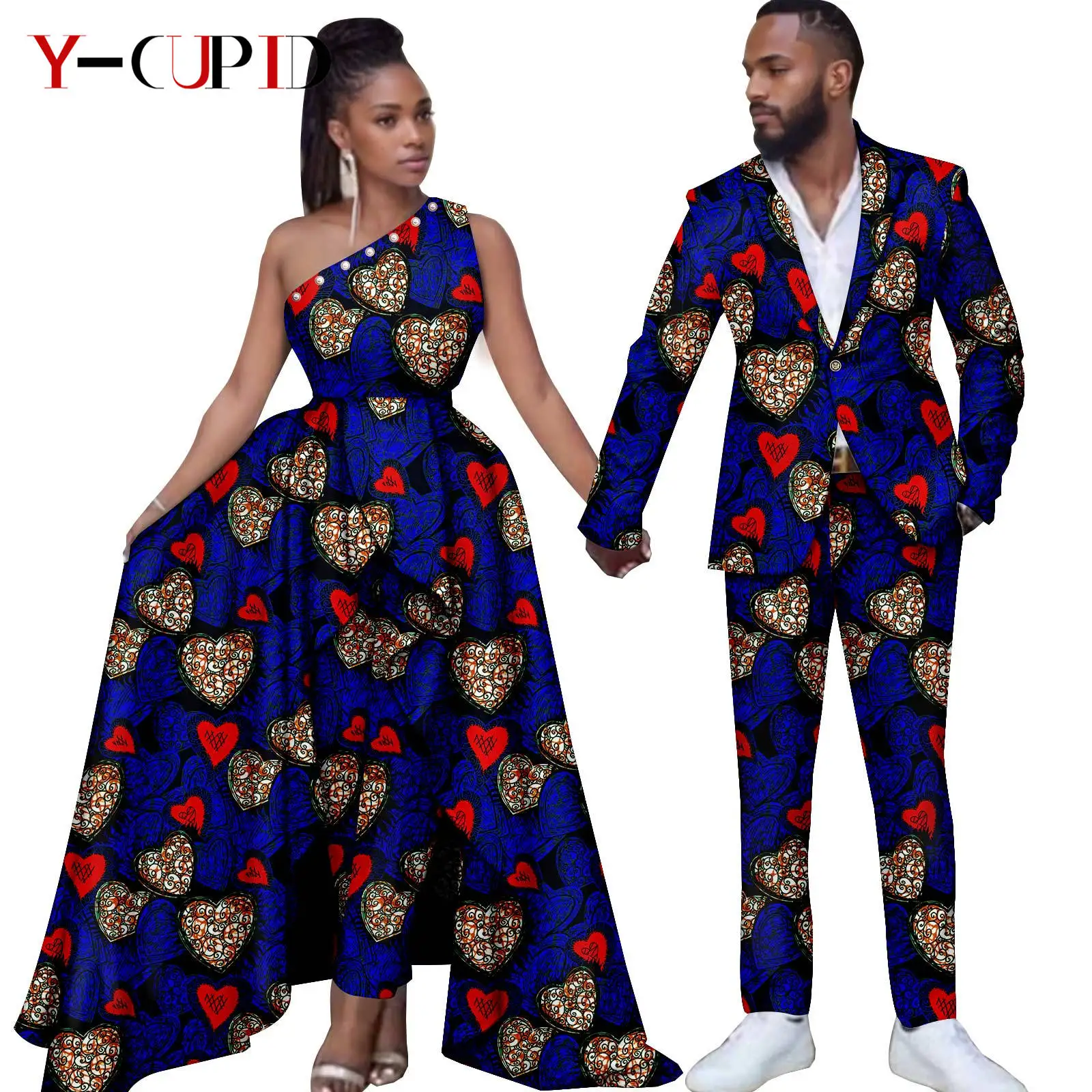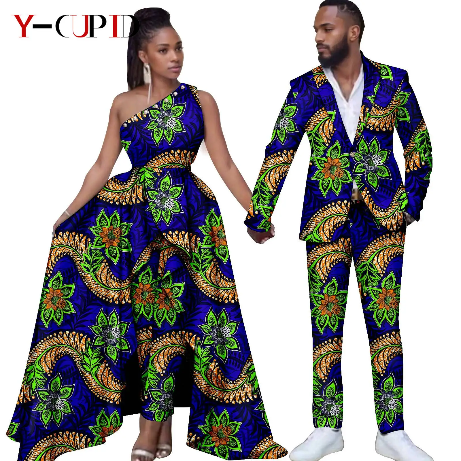 Elevate your style with these stunning African print long top dresses and pant for women, matched perfectly with couple outfits for men in dashiki formal sets.