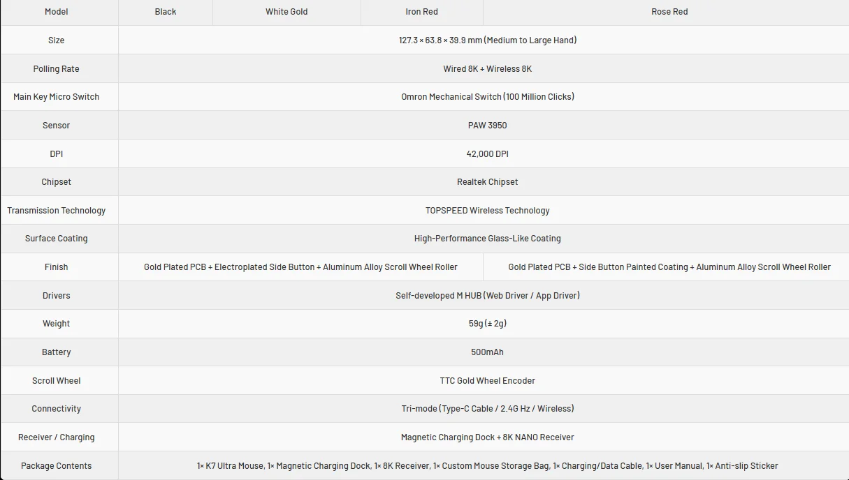 The MCHOSE K7 Ultra is our first tri-mode gaming mouse equipped with a magnetic wireless charging dock. Featuring the PAW3950 sensor, 8000 Hz polling rate, proprietary wireless technology, and an ultra-lightweight design, every element is engineered for competitive domination.