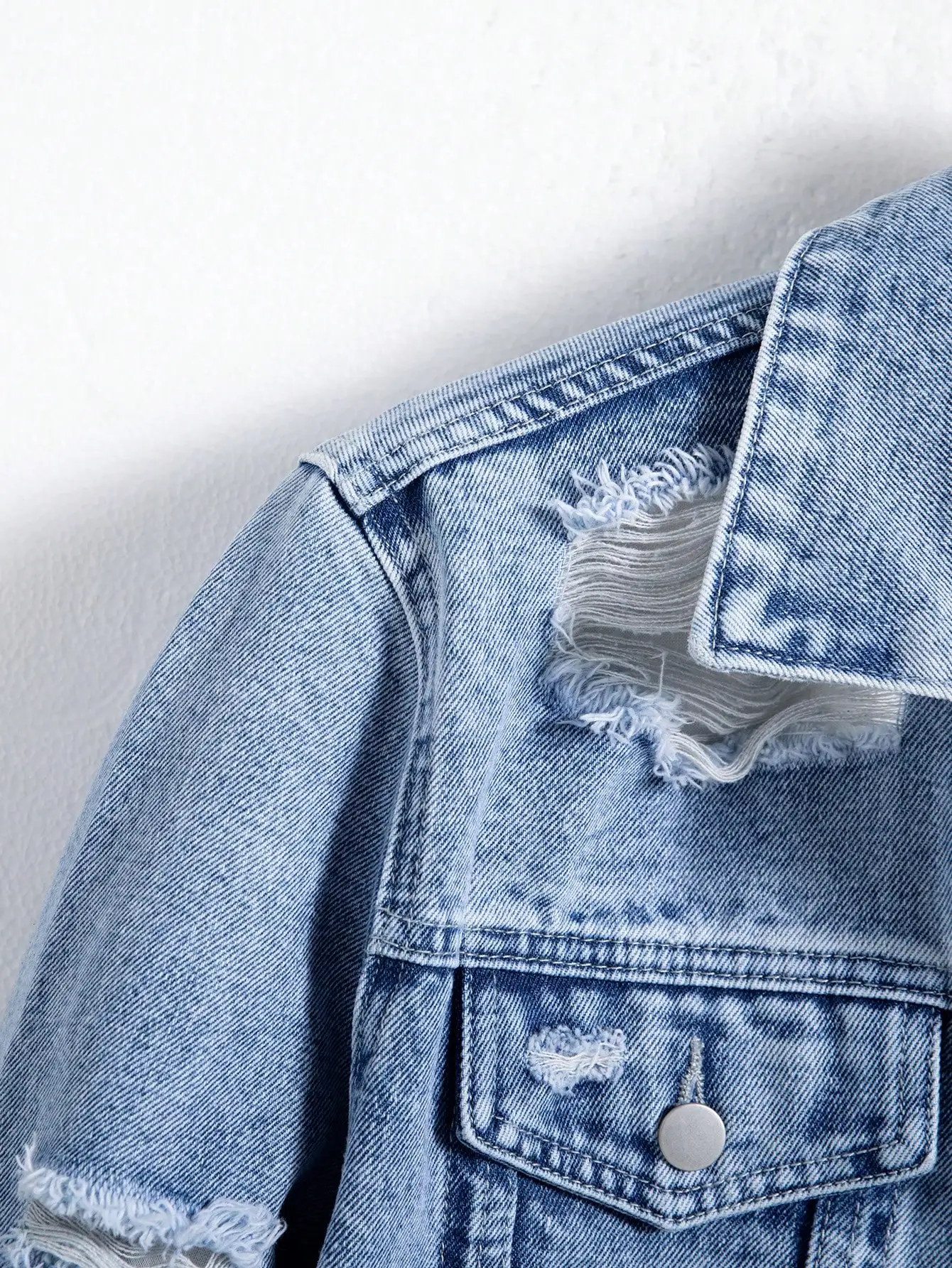 This is a light blue denim jacket, belonging to the category of ripped denim jackets. It has a classic denim style, with a turn-down collar and a front opening with metal buttons. The body of the jacket is covered with irregular rips and a faded and distressed finish, presenting a street – trendy and retro – personalized style. When paired with a white inner garment, it is suitable for various casual wearing scenarios, showing a casual and uninhibited sense of fashion.
