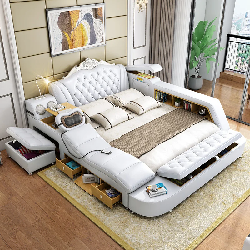 Enhance your bedroom with this smart and modern furniture set that offers a multi-functional massage bed. Choose from a variety of color options and enjoy the luxury of solid wood and genuine leather materials.