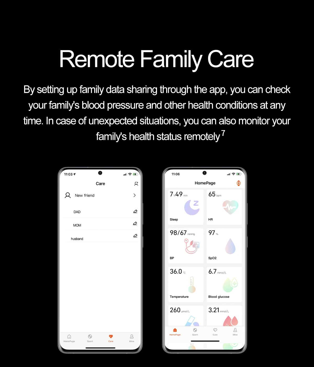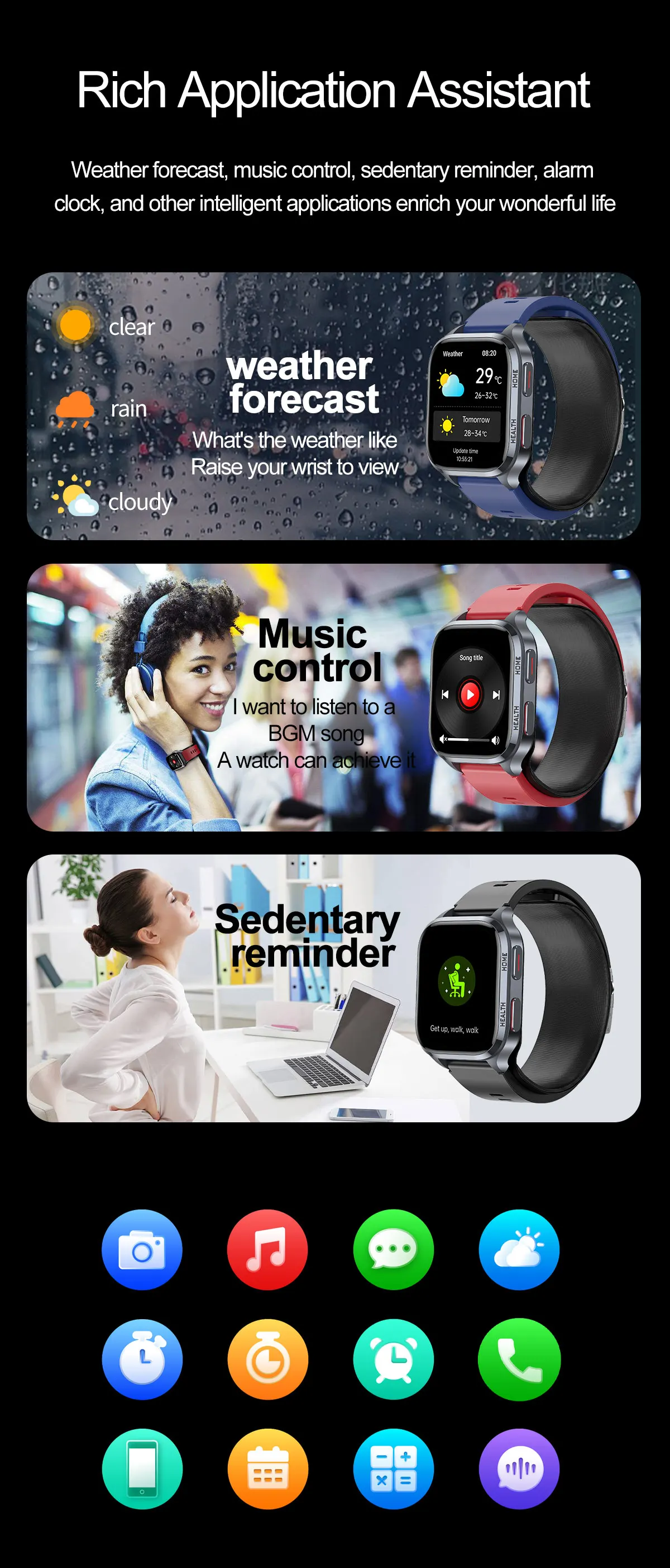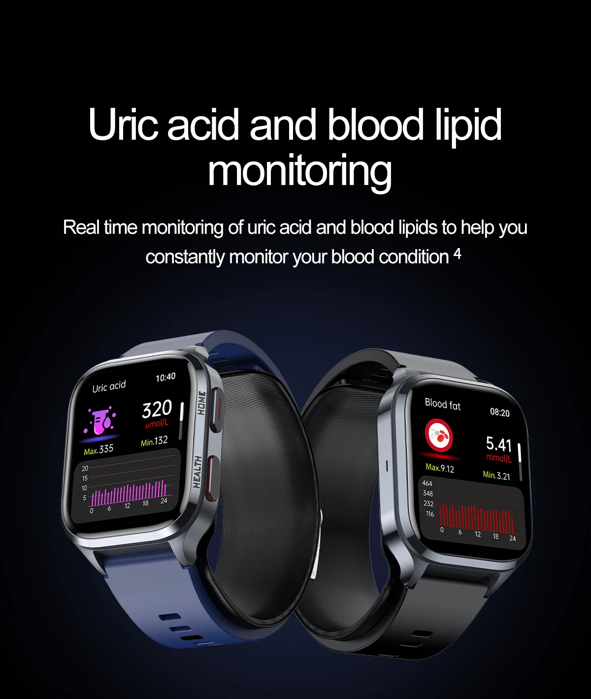 Air pump+air bag type true blood pressure accurate test, TPU ultra-thin comfortable air bag (detachable), blood pressure voice broadcast, blood pressure posture judgment, Bluetooth call,, uric acid monitoring, blood lipid monitoring, body temperature monitoring, blood oxygen monitoring, respiratory rate, sleep monitoring, remote relatives and friends care function, sedentary reminder and other health management functions.