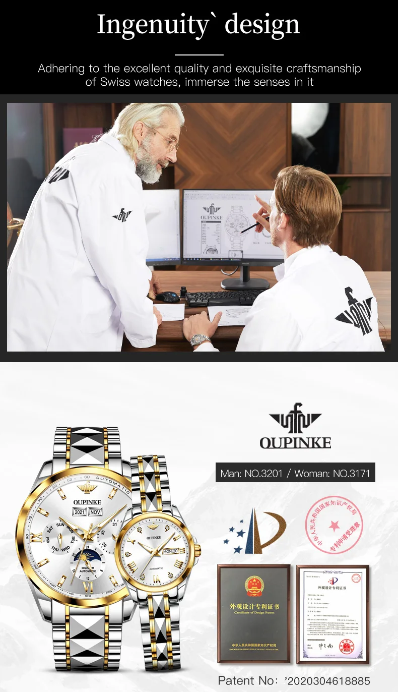 OLEVS Moon Phase Couple Watches for Men Women Original Mechanical Watch Set Tungsten Steel Waterproof Chronograph Lover's Watches