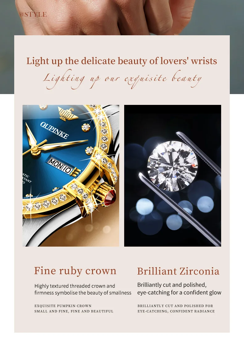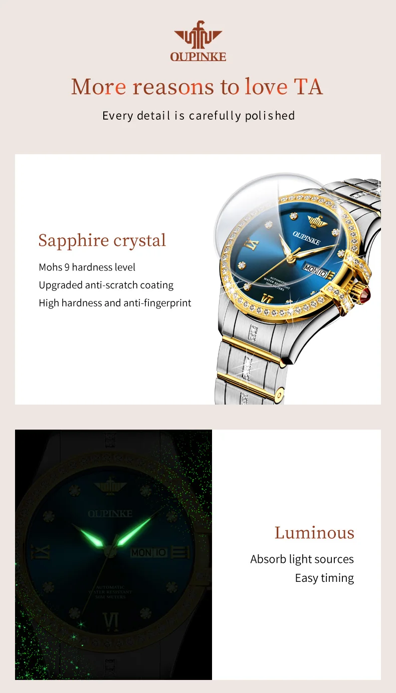 The OUPINKE 3195 Couple Watch is a luxurious set featuring fully automatic mechanical watches with a romantic diamond design. It is suitable for various occasions such as business, dress, and leisure, offering waterproof features and a luminous calendar. A perfect gift for couples.