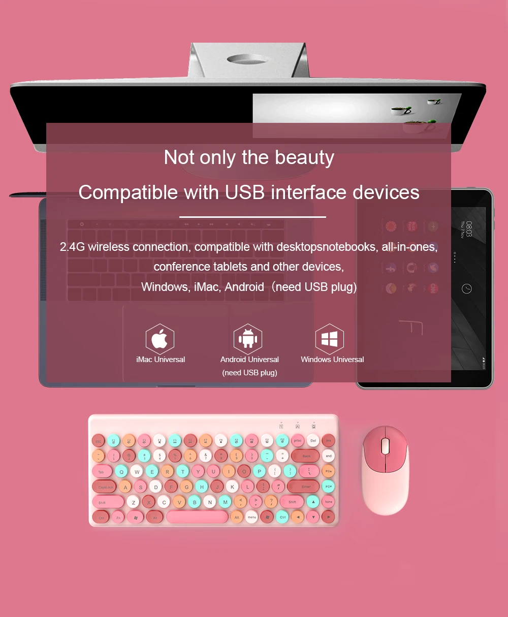 2.4G wireless connection, compatible with desktopsnotebooks, all-in-ones, conference tablets and other devices, Windows, iMac, Android (need USB plug)
