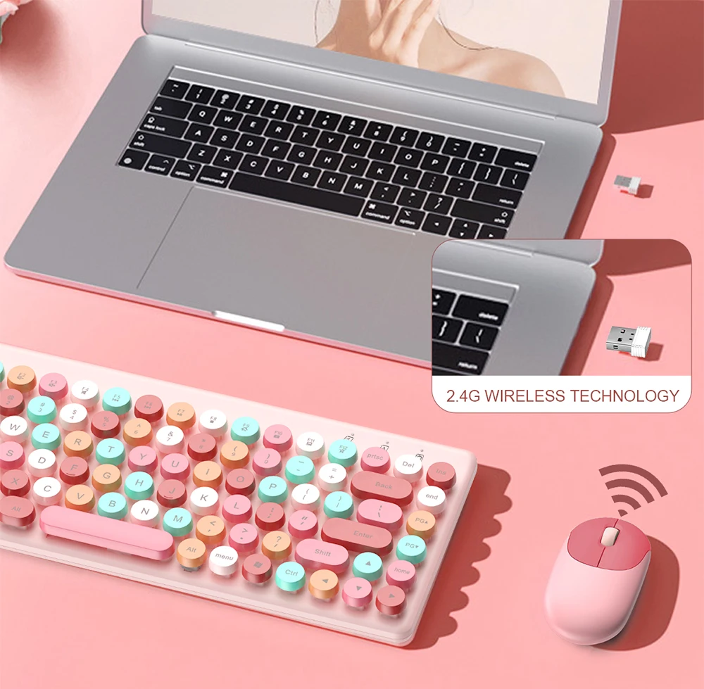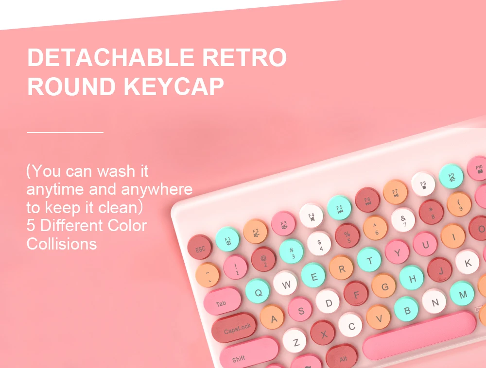 2.4G WIRELESS TECHNOLOGY; QUICK RESPONSEFit the fingertips light and thin chocolate independent keycaps fit the curvature of the fingertips, making the operation smoother, more comfortable to use, and enjoying faster input speed.MANY MULTIMEDIA HOTKEYSDETACHABLE RETRO ROUND KEYCAP