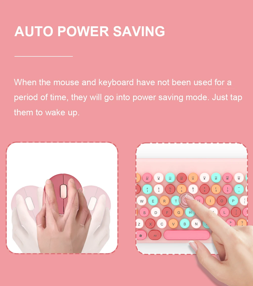 (You can wash it anytime and anywhere to keep it clean) 5 Different Color CollisionsAUTO POWER SAVING:When the mouse and keyboard have not been used for a period of time, they will go into power saving mode. Just tap them to wake up.KEYBOARD INDICATOR