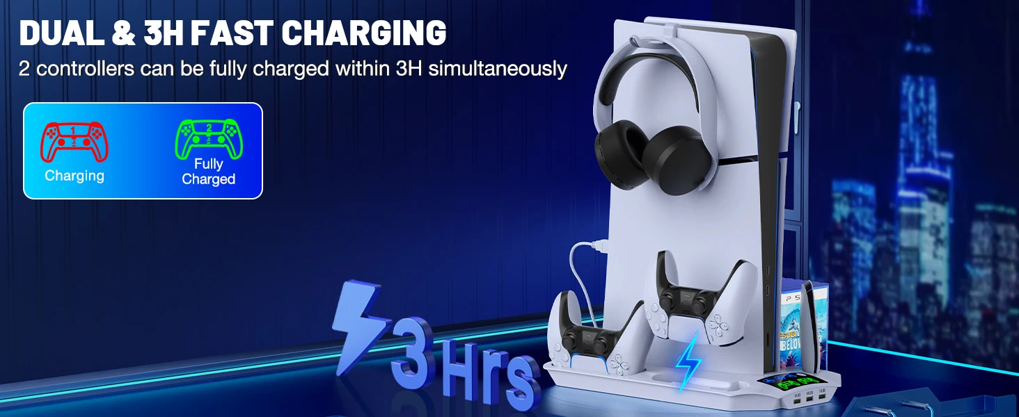 • Fast Dual Charging: Simultaneously charges two DualSense controllers in just 3 hours. Clear LED indicators (Red/Green) show real-time charging status.