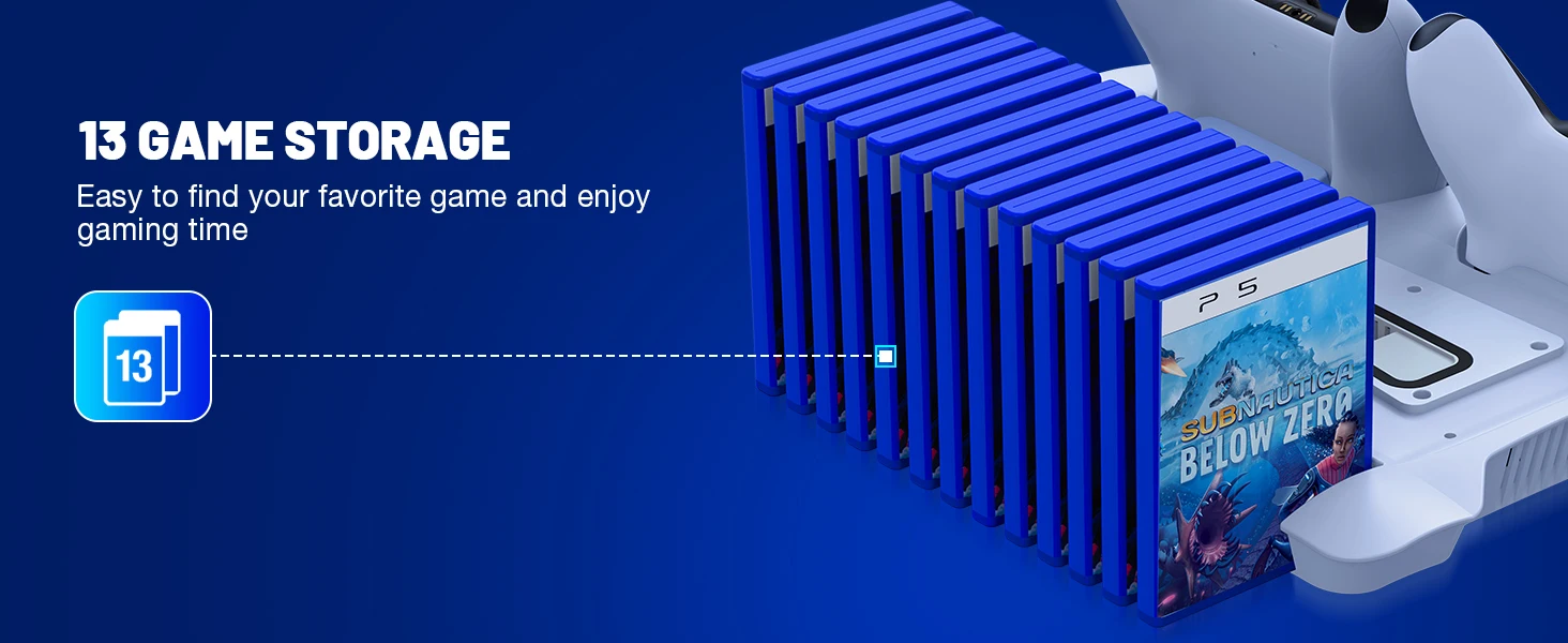 Maximize your gaming setup with the BEBONCOOL PS5 Stand. This stand is engineered for performance, convenience, and organization, offering essential features like an active cooling system, fast dual charging, dual power options, smart memory function, and enhanced organization.