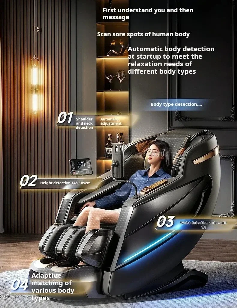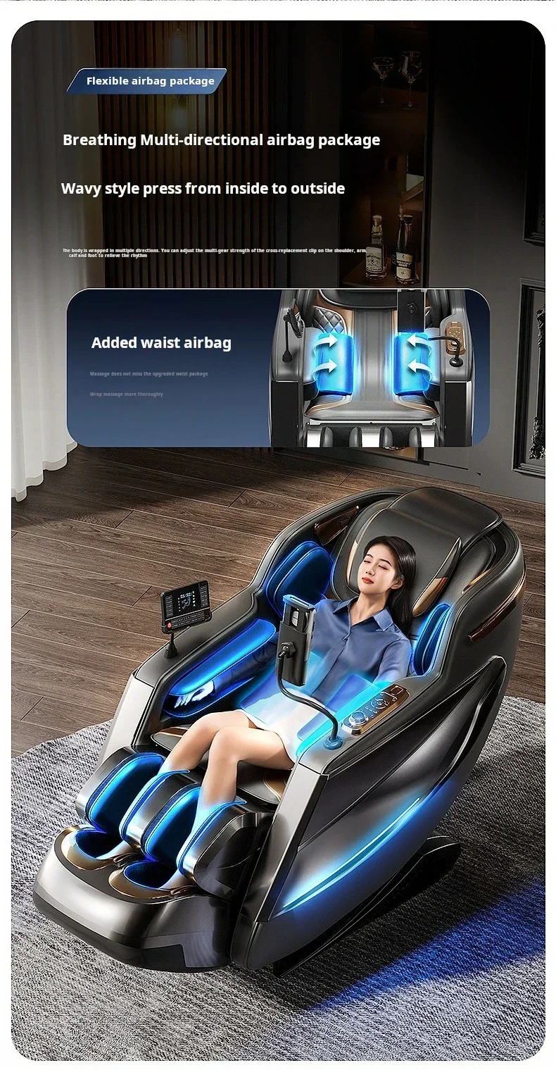 Experience ultimate relaxation with the latest Massage Chair, featuring 6D Zero Gravity Shiatsu, air pressure, human touch technology, and advanced massage functions for a comfortable and rejuvenating experience.