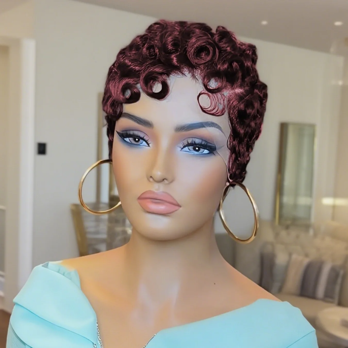 Discover a chic and trendy 13×4 lace front human hair wig designed for women with a short layered pixie cut in a stunning natural black dark 99J color. This wig offers a blend of curly wavy hair for a stylish and versatile look.