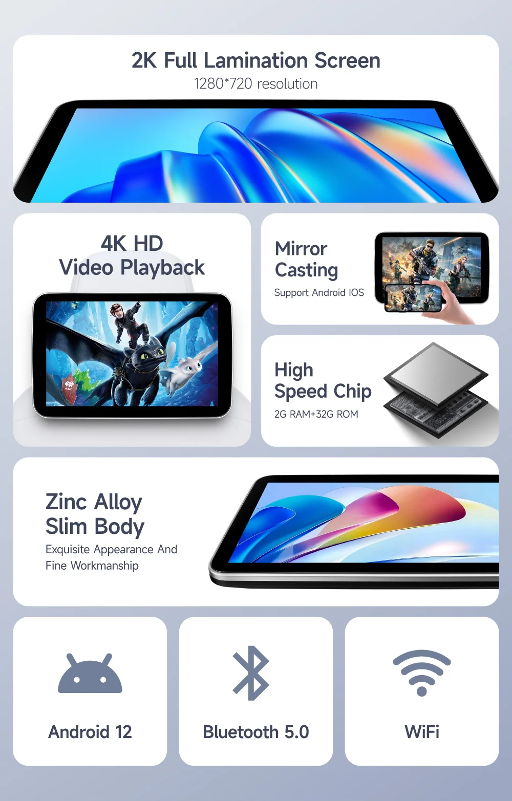 Ultra-Clear 10-inch Car Headrest Monitor with Wireless AirPlay for Android 12 Upgrades